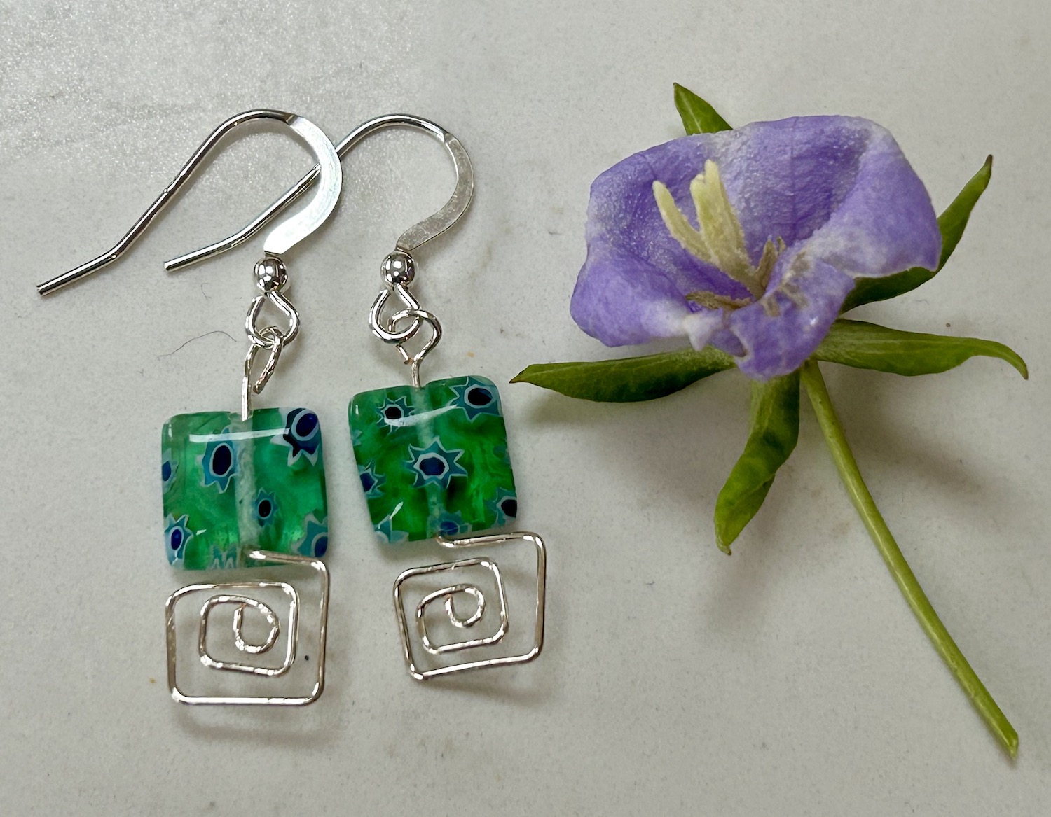 Green/blue millefiori glass bead and silver plated wire design. Sterling silver hooks. £15.