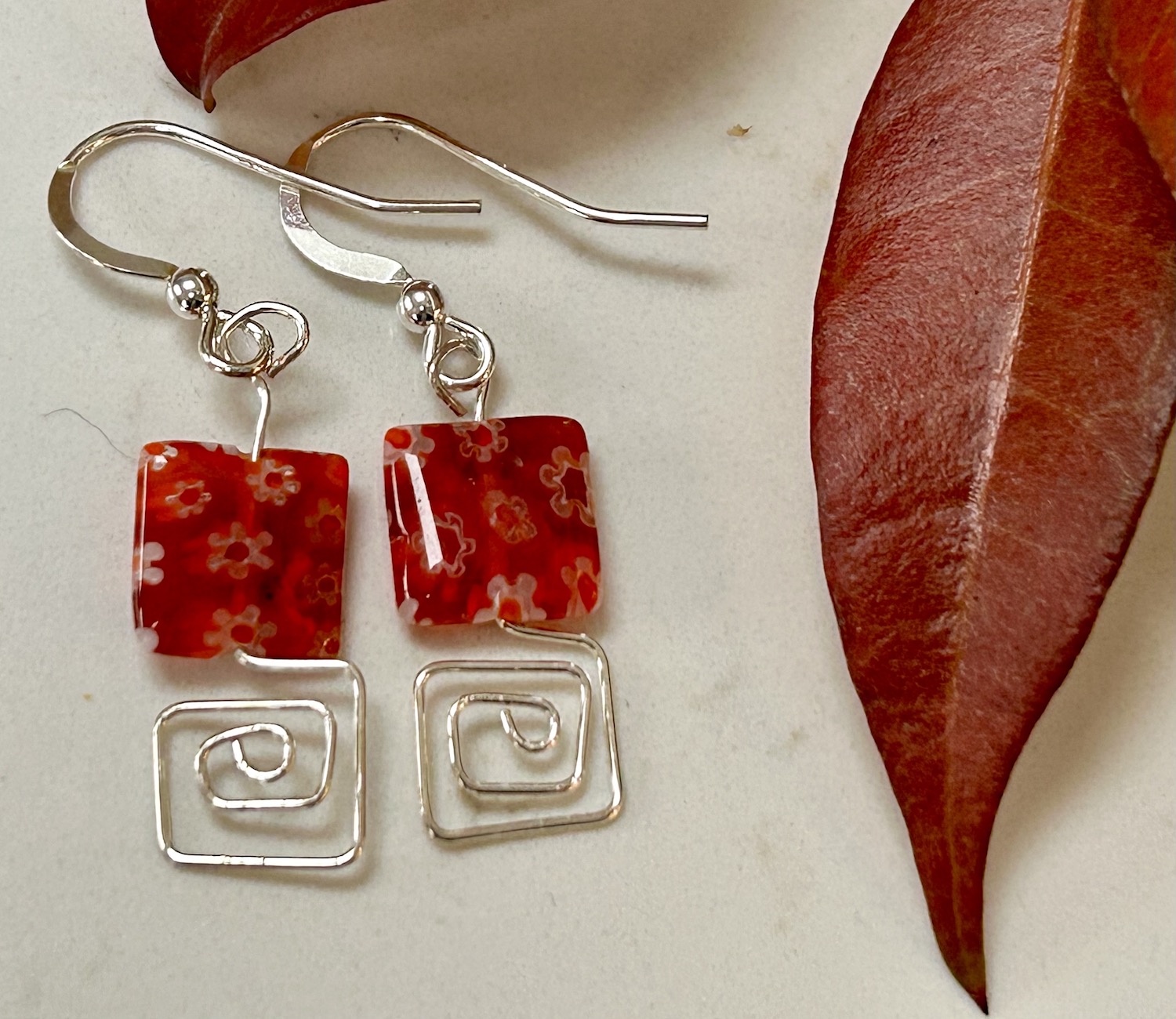 Red millefiori glass bead and silver plated wire design. Sterling silver hooks. £15.