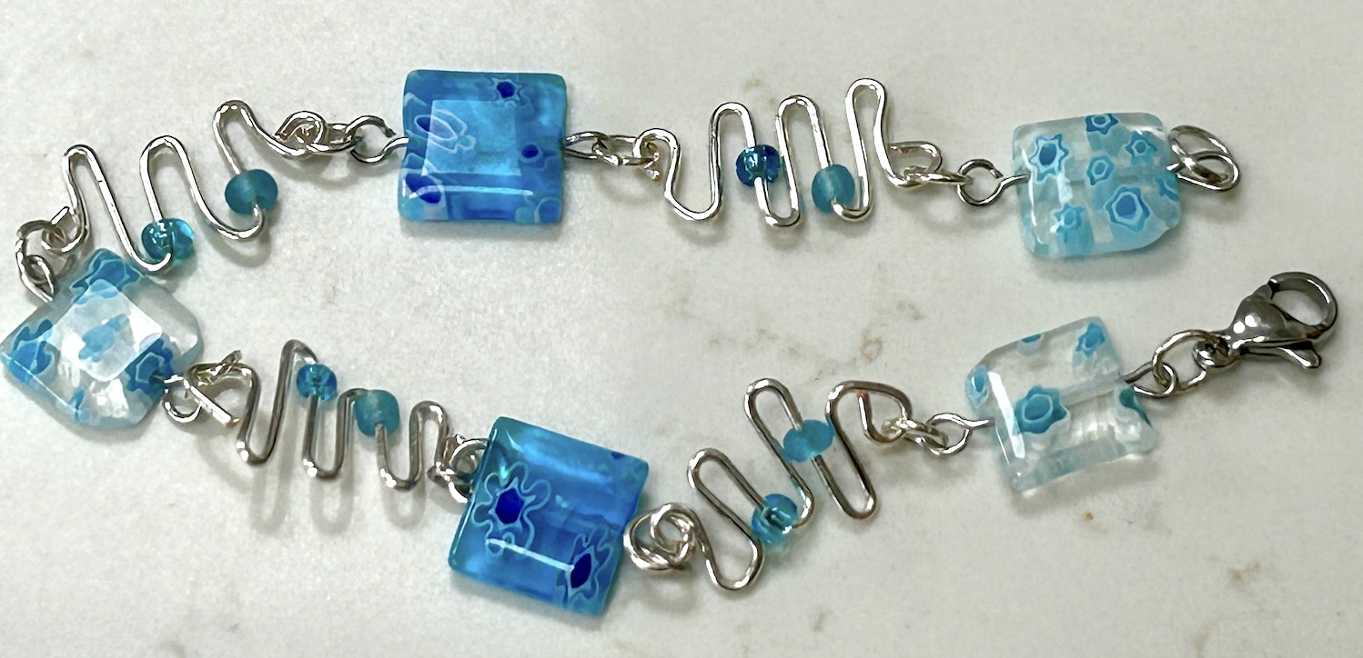 Blue millefiori glass and silver plated wire bracelet. Length including clasps 18cm. £22.50.