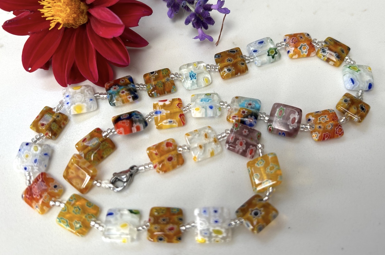 Millefiori glass bead necklace. Length: 16 inches (40.5cm) including clasps. Beads approx 1cm. £16.